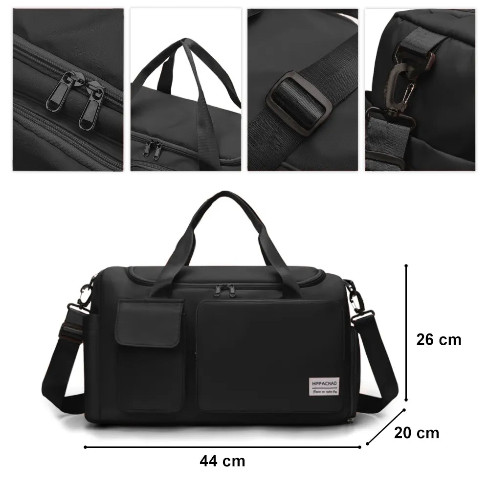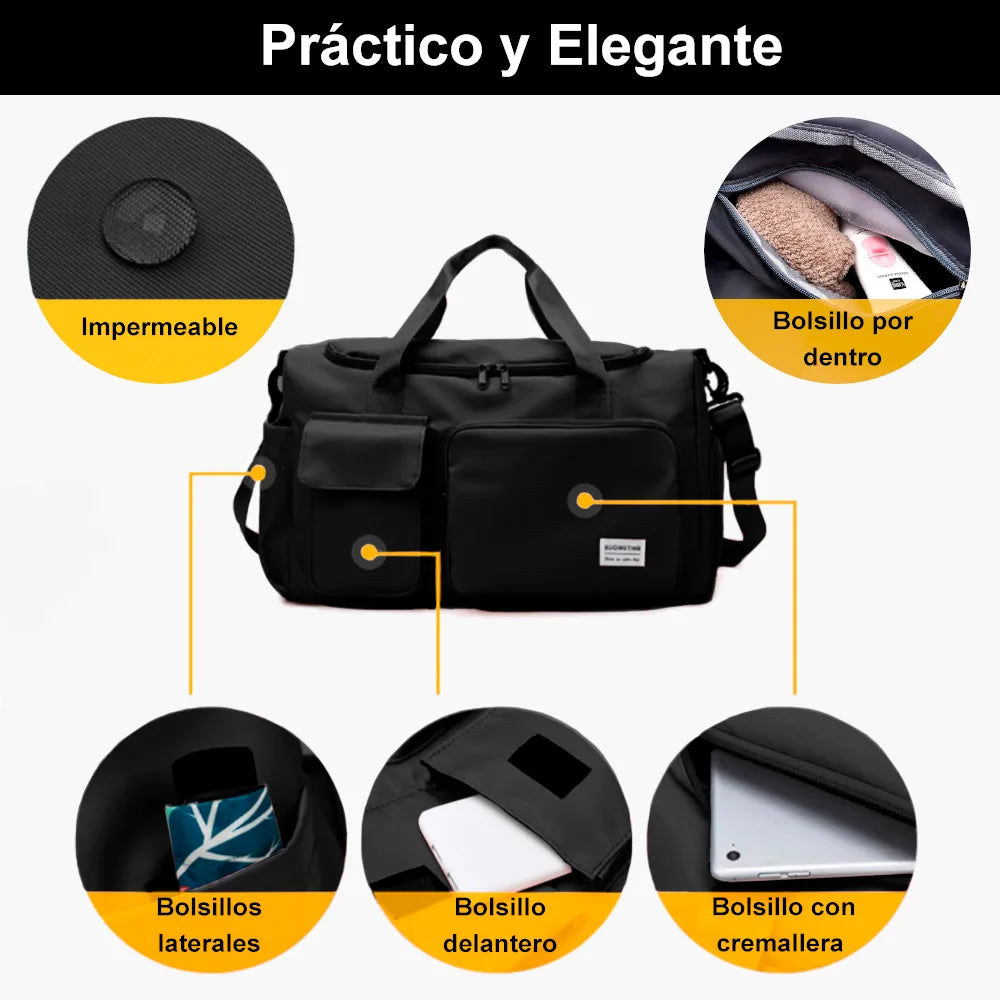 - Espacio amplio y funcional: Cuenta con un compartimento especial para zapatos y múltiples bolsillos internos para organizar tus artículos.